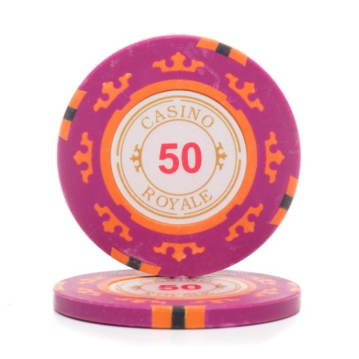 åÊCasino Royale poker chips are definitely one of the coolest poker chips we've ever offered. åÊSuper heavy 14 gram weight, matte finish, silver foil inset logo with 'CASINO ROYALE' åÊand the chip denomination (without currency symbol) all make this one fantastic poker chip. åÊThe edges feature 4 triple stripe edge spots with coordinating and contrasting colors. åÊYou'll be playing like the high rollers in no time when you break these chips out at your next game.