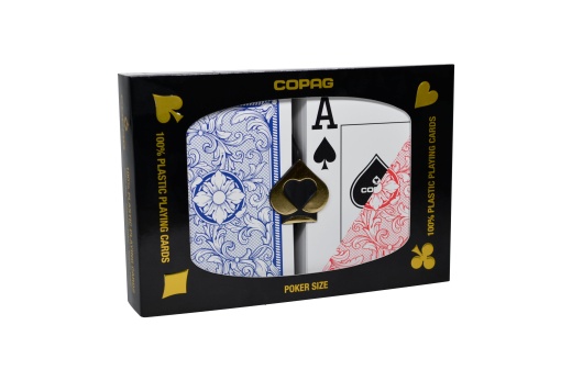 If you're tired of flimsy, paper-thin cards that bend and warp at the slightest touch, upgrade to the Copag Legacy Plastic Poker Size Jumbo Index Red/Blue Double-Deck Set. With its unbeatable combination of quality, durability, and style, this set is sure to elevate your gaming experience to new heights. Join the ranks of the gaming elite with Copag, the brand trusted by pros and enthusiasts alike.