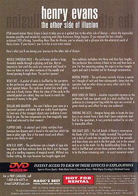 With a running time of approximately 1 hour 42 minutes, this DVD is a treasure trove of innovative magic, each effect meticulously crafted to entertain, bewilder, and delight. Join Henry Evans on this unforgettable journey to the other side of illusion, where the impossible becomes possible, and wonderful, surprising, and often humorous things happen.