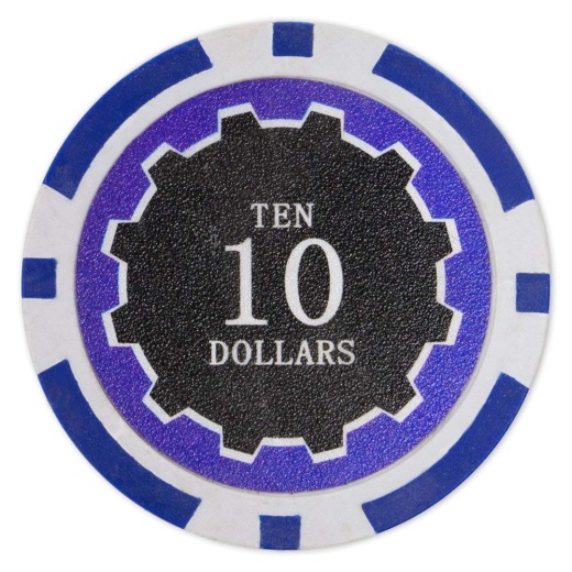 These heavyweight clay composite poker chips are good for cash and tournament games. Available in 11 denominations ranging from $0.25 to $5,000, for casual players and high rollers alike. They inlay art features a gear insignia and clear, legible denominations with high contrast, and the inlay's grippy texture makes stacking these chips a breeze.