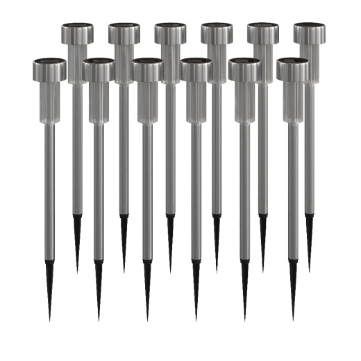 Whether you've moved to a new home and want to highlight its best features or just want to refresh the look of your backyard landscaping, this set of 12 stainless steel solar lights will get the job done. With no wires to tangle and no electrical outlets needed, these outdoor lights will automatically turn on at dusk when fully charged and can be placed wherever your design scheme requires. Switch the on/off button to the on position and the sun will power your solar lights giving you bright white lighting with no monthly bills. Solar power is renewable energy that is virtually maintenance free. The plastic bulb housing unit with stainless steel tops and posts are weatherproof and the LED bulbs will last for years making these modern solar lights a wise investment. 8 lumens will light your walking paths for safety as well as illuminating your flowers and plants for beauty. Going green is easy to accomplish with this set of LED lights. Assemble your new outdoor solar lights in less than 10 minutes for quick enjoyment. For best results, ensure the solar panels receive at least 6 hours of direct sunlight and are free from dust and debris by wiping with a damp cloth. From precision straight to whimsical placement, showcase your personal style with this solar light set. [DN-SL104-12-SS-GG]