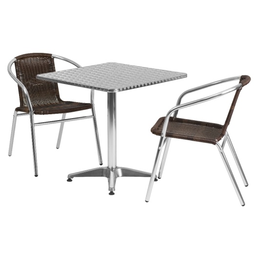 Create an enjoyable dining experience with this table set that will enhance your bistro, cafe, restaurant, hotel or home patio space. The designer style stainless steel table top features a smooth surface for keeping items level. The column and base are constructed of lightweight aluminum material. The chair is lightweight and easy to move and store. For easy storing and cleaning purposes these chairs stack up to 20 chairs high. This set was designed for all-weather use making it a great option for indoor and outdoor settings. For longevity, care should be taken to protect from long periods of wet weather. Whether you are just starting your business or upgrading your furniture this set will complete the look. [TLH-ALUM-28SQ-020CHR2-GG]