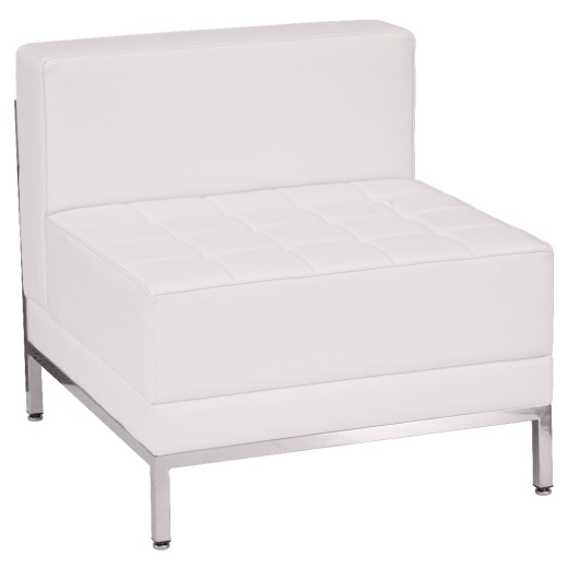 Moving your furniture around is a quick and easy way to change up the look and feel of your space so modular pieces like this white LeatherSoft upholstered middle chair are a must have. LeatherSoft is leather and polyurethane for added softness and durability. This modern armless chair gives an upscale, sophisticated look to any space and can be used in conjunction with other pieces or as a standalone. Exposed stainless steel and LeatherSoft upholstery master the art of mixed media giving you a distinctive look your guests and clients are sure to appreciate. As your business grows, you can add on more pieces and reconfigure your design. This innovative contemporary chair will bring comfort and trend-setting style to your waiting room, reception area or lounge.