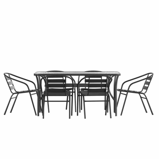 Wow your guests every time you host with this outdoor patio dining set that includes a table and six chairs. This commercial grade set is the perfect way to serve succulent meals and provide good times at your bar, restaurant, bistro, or lounge. The table features a 5 mm tempered glass top with a water wave pattern for sensational style, plus an umbrella hole so you can keep your guests cool and covered. The tabletop is heat-resistant up to 700 degrees so you can confidently serve all your favorite dishes. When dinner is served, give your guests comfortable seating with these six lightweight, stackable dining chairs. The chairs boast an ergonomic seat structure with a curved slat design that allows water to pass through for a reliable addition to your outdoor space. The table and all chairs feature durable powder-coated steel frames for weather and rust-resistance as well as fixed floor glides to prevent damage to floors. Thanks to their heavy duty construction, the table holds up to 130 lbs. static weight while each chair holds up to 350 lbs. static weight. The table assembles quickly and easily in under ten minutes while the chairs require no assembly. Clean-up is just as easy as setup, as this set can be wiped clean with a damp cloth. Maximize your outdoor space with a welcoming environment for your guests with this outdoor patio dining set.