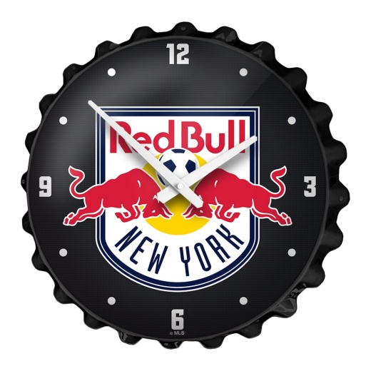 This New York Red Bulls large-scale replica bottle cap wall clock is sure to attract some attention. It's a great addition to any fan cave, game room, garage, or home office. Our bottle cap wall clock is injection molded with a high-resolution, digitally printed face that is given a high gloss finish. This is an officially licensed product of the Red Bulls and made in the USA.