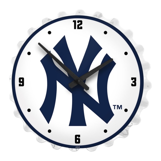 This New York Yankees large-scale replica bottle cap lighted wall clock is sure to attract some attention. its a great addition to any fan cave, game room, garage, or home office. Our lighted bottle cap wall clock is injection molded with a high-resolution, digitally printed face that is given a high gloss finish. It is illuminated with the latest in LED technology and only uses 12 volts of power. It comes with a 6-foot power cord and an in-line switch. This is an officially licensed product of New York and made in the USA.