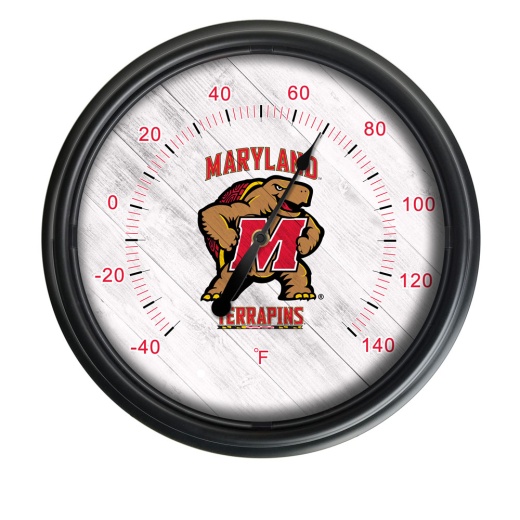 Add bold team style and dependable performance to any space. The Official Logo Indoor/Outdoor LED Thermometer delivers accurate temperature readings with durable construction built for both indoor and outdoor environments. A UV-resistant black ABS plastic casing protects the unit from sun exposure and weather, while a glass lens face provides a clean, polished look. A rubber gasket seals the inner housing to help block out moisture and dust for reliable performance. The face features a vibrant, full-color digital print created with UV-cured ink. This process produces sharp detail and fade-resistant graphics that stay bright over time. Four built-in LED lights illuminate the display for easy viewing. An integrated photo eye senses ambient light and automatically turns the LEDs on at night and off during the day. The lighting system operates on four D batteries (not included). Factory calibrated for precision, this thermometer measures temperatures from -40F to 140F. Choose from officially licensed logos or contact us for custom imprinting options. Ideal for patios, porches, garages, bars, and game rooms, the Official Logo Indoor/Outdoor LED Thermometer combines durability, visibility, and standout design.