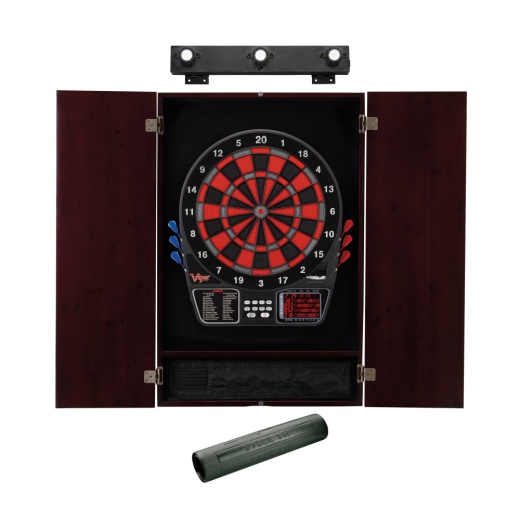- Includes Viper Metropolitan Mahogany Soft Tip Dartboard cabinet, Viper Vinyl Dart Mat, Shadow Buster Dartboard LED Light, and Viper 797 Electronic Dartboard that comes with six starter soft tip darts, 24 spare dart tips, AC adapter and storage slots built into the dartboard