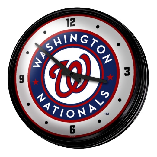 This premium Washington Nationals Retro Lighted Wall Clock will be sure to add the finishing touch to any room of the home or office. This piece is injection molded and features a high-resolution, high gloss digitally printed face. Comes with an 8-foot power cord and an on/off pull switch for the light. LED illuminated. Hanging hardware and light bulb included. This is an officially licensed product of Major League Baseball and the Nationals and made in the USA.