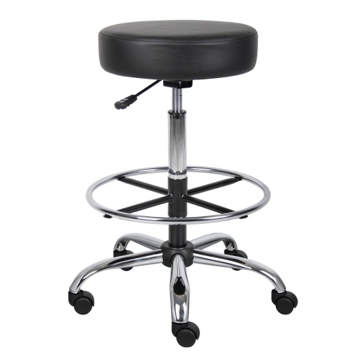 This medical stool is upholstered in durable Black, antimicrobial vinyl, and equipped with a 4 thick molded foam seat cushion that provides improved durability. It is attached with an easy to reach gas lift seat height adjustment lever, providing a vertical range of 6 to suit your personal comfort and work environment. The stools 20 chrome footring provides added foot and leg support. The hooded double wheel casters make it easy to move and shift directions.