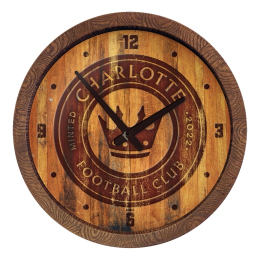 Our Charlotte FC Barrel Top Wall Clock is an affordable, durable, and easy to hang option for those who have always wanted a barrel top sign. This product is injection molded and hand stained to give it an authentic wood look. It is printed with automotive grade UV stable inks and given a high gloss finish. Bring the rustic look indoors with this great piece of wall decor that will bring style and functionality to any room of the home or office. This is an officially licensed product of Charlotte FC and made in the USA.