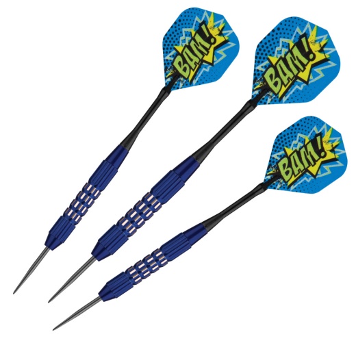 BAM! POW! Ka-BOOM! Embrace your inner hero and make an impact with the Viper Comix Steel Tip Darts designed for use with sisal dart boards. These darts are packed with features starting with the barrel, fashioned from brass alloy. Constructing the darts in this fashion allows us to bring you tough, weighted barrels without breaking the bank. Brass is an alloy that has been used in construction for its durability and great looking style, while maintaining a lower cost. We use this alloy to provide the highest quality barrels at the best cost to you. Each barrel enjoys unique grooves along the barrel, found on no other dart, allowing your grip to remain consistent throw after throw. The Comix Darts feature tough, lightweight aluminum shafts. These shafts feature locking holes that allow a more secure fit to your barrel; you wont find yourself retightening these shafts after a shot or two. Finally, each dart is finished off with awesome comic graphics featuring BAM, POW, AND Ka-BOOM adorning each flight, for a marvelous look on each dart. Each set includes three extra flights, three extra nylon shafts, and a dart mechanic repair tool.