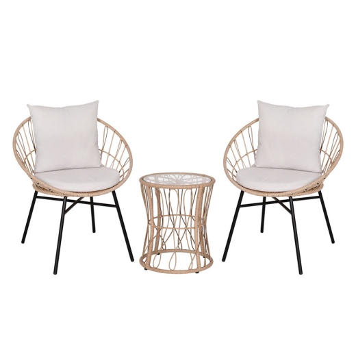 Entertain friends or relax with your morning coffee with the trendy, boho look of this 3 piece polyethylene rattan table and 2 chair set. The rounded papasan style seats, and plush, foam padded, polyester back and seat cushions will quickly become your favorite spot indoors or out. The matching accent table, with a 5mm thick tempered glass top, completes the look and gives you the perfect spot for drinks, snacks, or decorative items. Weather and fade resistant materials paired with powder coated steel frames, allow this versatile set to find a home on the deck, patio, poolside, or in the sunroom. The chairs feature fixed floor glides while the table has adjustable glides for a level, stable surface and prevents damage to hard flooring surfaces when used indoors. The table arrives preassembled and ready for use and the chairs go together in 10 minutes or less per piece for quick setup. Frames wipe clean with a damp cloth and the zippered, removable cushion covers may be wiped with damp cloth or hand washed and air dried for a deeper clean. [TW-VN017-18-TAN-GG]