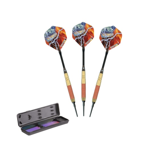 Call upon the fury of the elements and rain terror down onto your hapless opponents when you bring the Elkadart Storm Soft Tip Darts, designed for use with either electronic dart boards or most sisal dart boards. These darts are packed with features starting with the barrel, fashioned from specially coated metal alloy. Constructing the darts in this fashion allows us to bring you tough, weighted barrels without breaking the bank. Used in construction for its high end appearance and durability at a lower cost, we use this alloy to provide the highest quality barrels at the best cost to you. Each barrel possesses recessed rings, allowing your grip to remain precise throw after throw. The Storm Darts feature tough, lightweight aluminum shafts. These shafts feature locking holes that allow a more secure fit to your barrel; you wont find yourself retightening these shafts after a shot or two. Finally, each dart is finished off with devastating lightning designs adorning each flight, for an elemental look on each dart. Each set includes three flights, three shafts, three 2BA Tufflex II Tips and a slim dart case.