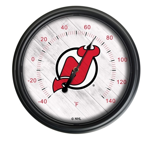 The Holland Bar Stool Co.s indoor/outdoor LED New Jersey Devils Logo Thermometers are the perfect way to show your team pride. These Thermometers are made to handle the outside environment. The casing is made from a UV resistant black ABS plastic and the glass face lens has a rubber gasket to seal the weather from the inner thermometer housing. Four LED lights are controlled by a photo eye, turning on automatically when it is dark to illuminate the thermometer face. LED lights run off 4 D batteries (not included). Artwork is digitally printed with UV inks to ensure years of fade free, vibrant colors. Whether purchasing as a gift for a sports super fan, or for yourself, you can take satisfaction knowing you're buying a clock that is proudly brought to you by the Holland Bar Stool Company.