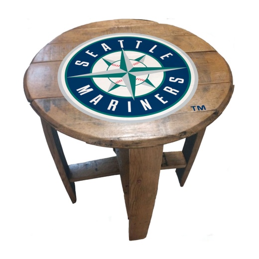 Liven up your living room or fan cave with this offically licensed SEATTLE MARINERS Custom Made Oak Barrel Table from Imperial! Made from an authentic Kentucky oak charred whiskey barrel, this rustic-style table is one of a kind and looks great in any room. The team logo is applied by injecting UV resistant ink into the oak and then sealing. The table measures 21 inches in diameter and is 24 inches high. This product is officially licensed by the MLB and is made in the USA.