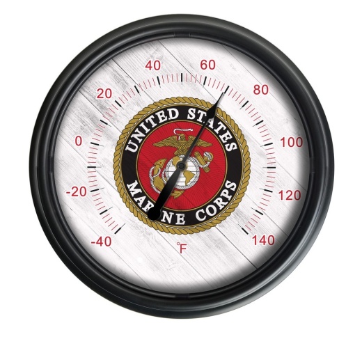 The Holland Bar Stool Co.s indoor/outdoor LED Logo Thermometers are the perfect way to show your support for our troops. These Thermometers are made to handle the outside environment. The casing is made from a UV resistant black ABS plastic and the glass face lens has a rubber gasket to seal the weather from the inner thermometer housing. Four LED lights are controlled by a photo eye, turning on automatically when it is dark to illuminate the thermometer face. LED lights run off 4 D batteries (not included). Artwork is digitally printed with UV inks to ensure years of fade free, vibrant colors. Take satisfaction knowing you're buying a thermometer that is proudly brought to you by the Holland Bar Stool Company.