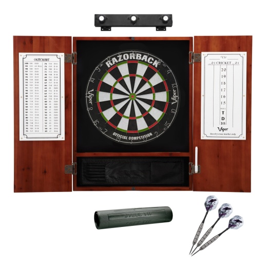Viper Razorback Sisal Dartboard, Metropolitan Cinnamon Cabinet, Shadow Buster Dartboard Lights, Padded Dart Mat & Underground Raven Steel Tip Darts