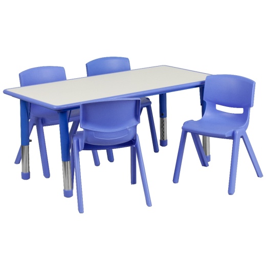 Encourage creativity in budding students with specialty designed classroom furniture to encourage learning. Designed for safety around rambunctious toddlers, the table has rounded corners and the plastic stack chairs are constructed of metal-free materials. This activity table set serves as a play table or kids dining table in the classroom or home. Built for comfort, the shell chairs are a one-piece contoured designed to promote proper posture. Not only are these chairs designed properly, but they are lightweight so kids can feel independent by moving the chairs themselves. With this play activity table set setup in the playroom you're always prepared for play dates and birthday parties. Low in maintenance, these toddler chairs and activity table wipe clean with ease after snacks. This play activity table set will be your all purpose set for meal time, snacks, crafts and learning activities. As your child grows out of the 10" seat chair, replace with our 12" plastic stackable school chair or 13.25" plastic stackable school chair. [YU-YCY-060-0034-RECT-TBL-BLUE-GG]