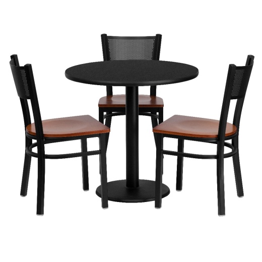 Don't have time to search through hundreds or thousands of table and seating options? This complete Banquet Table and Chair set saves you time to focus on your growing business. This set includes an elegant Black Laminate Table Top, Round Base and 3 Metal Grid Back Chairs. Surface is heat, scratch and moisture resistant. Easily clean using a mild detergent and water, dry clean to keep your tables spotless. Use this setup in banquet halls, wedding ceremonies, hotel conferences, restaurants, break room/cafeteria settings or any other social gathering. The lightweight designer metal chair will enhance any environment. Whether you are just starting your business or upgrading your home or business furniture this restaurant quality table set will round out your dining space. [MD-0007-GG]