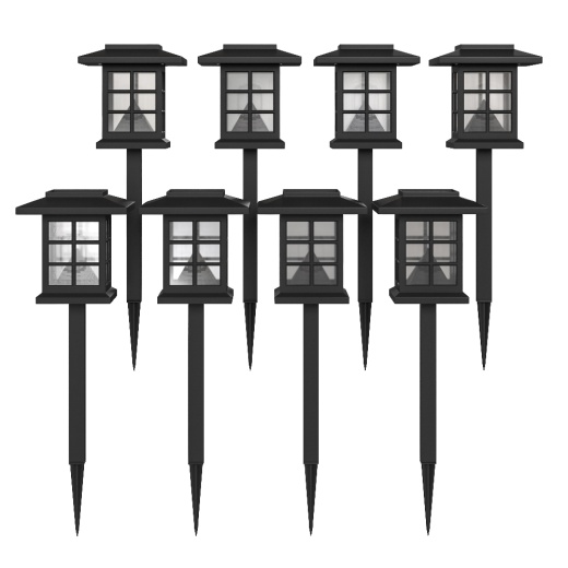 Reveal the beauty of your new or existing home with this set of 8 black lantern design solar lights. The hassle-free installation means no tangled wires and no electrical outlets needed. Simply switch the on/off button to the on position and let these outdoor lights give you a custom layout. The sun will power these on-trend solar lights that automatically come on at dusk giving you ample lighting with no monthly bills. Solar power is renewable energy that is virtually maintenance free. The polypropylene composition is weather-resistant and the bright white LED bulbs will last for years making these modern solar lights a wise investment. 8 lumens will light your walking paths for safety as well as illuminating your flowers and plants for beauty. Going green is easy to accomplish with this set of LED lights. The AAA rechargable battery is included and assembly of your new outdoor solar lights takes less than 10 minutes for quick setup. For best results, ensure the solar panels are in direct sunlight for at least 6 hours and are free from dust and debris by wiping with a damp cloth. Showcase your personal style with this stylish solar light set.