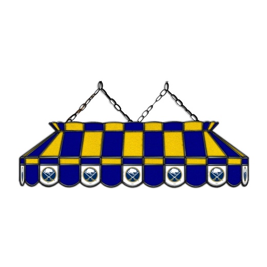 What better way to properly light your pool table with team spirit than with this officially licensed Buffalo Sabres 40" Billiard Lamp? Real hand-cut stained glass with team colors and logos looks great in any game room. Team logos (14 total) are screen-printed directly onto the glass. Includes hanging chain, ceiling mounting plate, and installation instructions. This product is officially licensed by the NHL and is made in the USA.