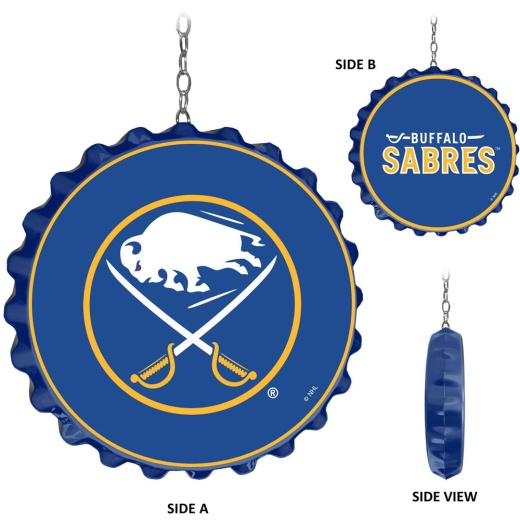 This double-sided Buffalo Sabres large-scale bottle cap replica is injection molded and features a high resolution digitally printed face with a high gloss finish on both sides. Hang this from the ceiling of any room and watch it immediately draw attention and give your fan cave, bedroom, or garage that finishing touch. This is an officially licensed product of NHL and made in the USA.