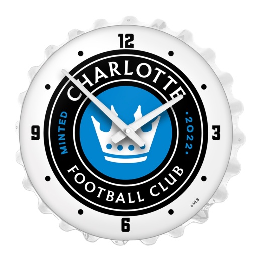 This Charlotte FC large-scale replica bottle cap lighted wall clock is sure to attract some attention. It's a great addition to any fan cave, game room, garage, or home office. Our lighted bottle cap wall clock is injection molded with a high-resolution, digitally printed face that is given a high gloss finish. It is illuminated with the latest in LED technology and only uses 12 volts of power. It comes with a 6-foot power cord and an in-line switch. This is an officially licensed product of Charlotte FC and made in the USA.