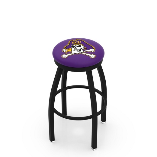 Made for the ultimate sports fan, you will be proud to show where your loyalty lies with this impressive Officially Licensed East Carolina U. stool from the Holland Bar Stool Co. This contemporary L8B2B stool has a single-ring black wrinkle base with a 2 1/2" thick cushion sitting on top of a 2" black wrinkle ring that conceals the swivel for an exceptionally clean look. A state of the art print process is used in applying specially formulated UV vinyl ink in numerous stages to produce a sharp, crisp, clear image to ensure a perfect reproduction of the logo. You won't find a higher quality logo stool on the market. The frame is made from commercial quality 16 gauge, 1 1/4 inch tube steel with solid mig welded joints to guarantee strength and durability. The powder coated finish resists chips and scratches and ensures a long-lasting, rich appearance. The cushion seats are of the highest quality as well, utilizing a breathable, commercial grade vinyl. At the heart of the cushion is highly-dense, US made foam that provides maximum support and will not breakdown in a couple years. If you're going to finish your bar, game room, or man cave do it right- with a logo stool made in the USA by the Holland Bar Stool Co.