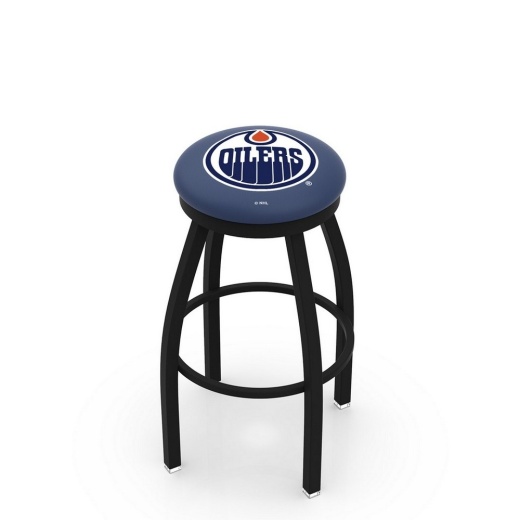 Made for the ultimate sports fan, you will be proud to show where your loyalty lies with this impressive Officially Licensed Edmonton Oilers stool from the Holland Bar Stool Co. This contemporary L8B2B stool has a single-ring black wrinkle base with a 2 1/2" thick cushion sitting on top of a 2" black wrinkle ring that conceals the swivel for an exceptionally clean look. A state of the art print process is used in applying specially formulated UV vinyl ink in numerous stages to produce a sharp, crisp, clear image to ensure a perfect reproduction of the logo. You won't find a higher quality logo stool on the market. The frame is made from commercial quality 16 gauge, 1 1/4 inch tube steel with solid mig welded joints to guarantee strength and durability. The powder coated finish resists chips and scratches and ensures a long-lasting, rich appearance. The cushion seats are of the highest quality as well, utilizing a breathable, commercial grade vinyl. At the heart of the cushion is highly-dense, US made foam that provides maximum support and will not breakdown in a couple years. If you're going to finish your bar, game room, or man cave do it right- with a logo stool made in the USA by the Holland Bar Stool Co.