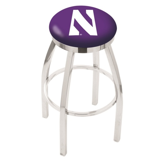 Made for the ultimate sports fan, you will be proud to show where your loyalty lies with this impressive Officially Licensed Northwestern University stool from the Holland Bar Stool Co. This contemporary L8C2C swivel stool has a single-ring chrome base with a 2 1/2" thick cushion sitting on top of a 2" chrome ring that conceals the swivel for an exceptionally clean look. A state of the art print process is used in applying specially formulated UV vinyl ink in numerous stages to produce a sharp, crisp, clear image to ensure a perfect reproduction of the logo. You won't find a higher quality logo stool on the market. The frame is made from commercial quality 16 gauge, 1 1/4 inch tube steel with solid mig welded joints to guarantee strength and durability. The triple chrome plated finish resists chips and scratches and ensures a long-lasting, rich appearance. The cushion seats are of the highest quality as well, utilizing a breathable, commercial grade vinyl. At the heart of the cushion is highly-dense, US made foam that provides maximum support and will not breakdown in a couple years. If you're going to finish your bar, game room, or man cave do it right- with a logo stool made in the USA by the Holland Bar Stool Co.