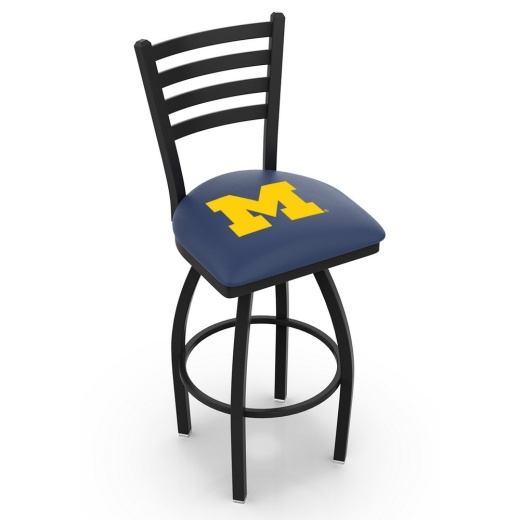 Made for the ultimate sports fan, you will be proud to show where your loyalty lies with this impressive Officially Licensed stool from the Holland Bar Stool Co. This L014 swivel Michigan Wolverines logo stool has a defined Ladder Back style that doesn't just add comfort, but sophistication. A state of the art print process is used in applying specially formulated UV vinyl ink in numerous stages to produce a sharp, crisp, clear image to ensure a perfect reproduction of the logo. You won't find a higher quality logo stool on the market. The frame is made from commercial quality 16 gauge, 1 1/4 inch tube steel with solid mig welded joints to guarantee strength and durability. The powder coated finish resists chips and scratches and ensures a long-lasting, rich appearance. The cushion seats are of the highest quality as well, utilizing a breathable, commercial grade vinyl. At the heart of the cushion is 2 1/2 inches of highly-dense, US made foam that provides maximum support and will not breakdown in a couple years. If you're going to finish your bar, game room, or man cave do it right- with a logo stool made in the USA by the Holland Bar Stool Co.