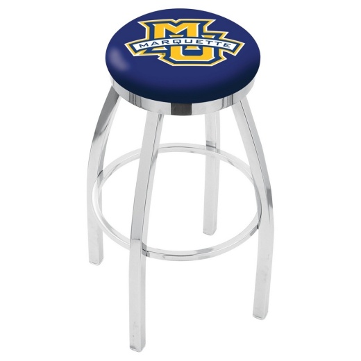 Made for the ultimate sports fan, you will be proud to show where your loyalty lies with this impressive Officially Licensed Marquette University stool from the Holland Bar Stool Co. This contemporary L8C2C swivel stool has a single-ring chrome base with a 2 1/2" thick cushion sitting on top of a 2" chrome ring that conceals the swivel for an exceptionally clean look. A state of the art print process is used in applying specially formulated UV vinyl ink in numerous stages to produce a sharp, crisp, clear image to ensure a perfect reproduction of the logo. You won't find a higher quality logo stool on the market. The frame is made from commercial quality 16 gauge, 1 1/4 inch tube steel with solid mig welded joints to guarantee strength and durability. The triple chrome plated finish resists chips and scratches and ensures a long-lasting, rich appearance. The cushion seats are of the highest quality as well, utilizing a breathable, commercial grade vinyl. At the heart of the cushion is highly-dense, US made foam that provides maximum support and will not breakdown in a couple years. If you're going to finish your bar, game room, or man cave do it right- with a logo stool made in the USA by the Holland Bar Stool Co.