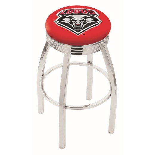 Made for the ultimate sports fan, you will be proud to show where your loyalty lies with this impressive Officially Licensed stool Univ. of New Mexico from the Holland Bar Stool Co. This classic L8C3C stool features a single-ring chrome base with a 2 1/2" thick cushion sitting on top of a 2.75" chrome ribbed ring that conceals the swivel for an exceptionally clean look. A state of the art print process is used in applying specially formulated UV vinyl ink in numerous stages to produce a sharp, crisp, clear image to ensure a perfect reproduction of the logo. You won't find a higher quality logo stool on the market. The frame is made from commercial quality 16 gauge, 1 1/4 inch tube steel with solid mig welded joints to guarantee strength and durability. The triple chrome plated finish resists chips and scratches and ensures a long-lasting, rich appearance. The cushion seats are of the highest quality as well, utilizing a breathable, commercial grade vinyl. At the heart of the cushion is highly-dense, US made foam that provides maximum support and will not breakdown in a couple years. If you're going to finish your bar, game room, or man cave do it right- with a logo stool made in the USA by the Holland Bar Stool Co.