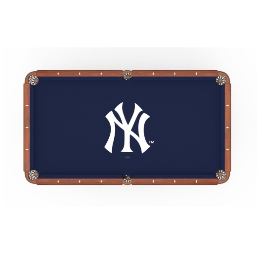 Looking to set your pool table apart from the others? Look no further than a New York Yankees logo billiard cloth from the Holland Bar Stool Co. Manufactured by Hainsworth of England, they start with their renown Worsted cloth and the logo is dyed into the cloth resulting in a perfectly smooth, even play surface with no effect to ball play. Having a worsted cloth means it is woven with yarn that is combed to remove the short fibers, making the cloth smoother which results in balls running faster with much more consistent speed. Worsted cloth is more durable and will not compress to form gullies on the table. Hainsworth worsted cloth stands apart from other cloths on the market because it incorporates: finer yarn meaning greater thread count per inch; quality dye chemicals that coat the fibers better and are less likely to fade; extensive finishing to remove loose fibers to ensure the smoothest, flattest surface, increasing ball speed and consistancy; durability, stretch and quality of fiber checked at every stage of the manufacturing; state of the art modern manufacturing machinery to guarantee quality and construction of the cloth. If you are looking to cover your new table or put new life into an existing table, look no further than the Hainsworth logo cloth offered by the Holland Bar Stool Co. Cloth sets come with enough material to cover rails and bed.