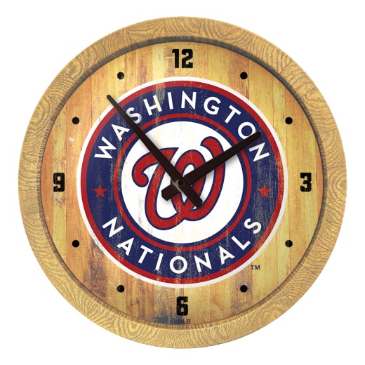 Our Washington Nationals Barrel Top Wall Clock is an affordable, durable, and easy to hang option for those who have always wanted a barrel top sign. This product is injection molded and hand stained to give it an authentic wood look. It is printed with automotive grade UV stable inks and given a high gloss finish. Bring the rustic look indoors with this great piece of wall decor that will bring style and functionality to any room of the home or office. This is an officially licensed product of Major League Baseball and the Nationals and made in the USA.