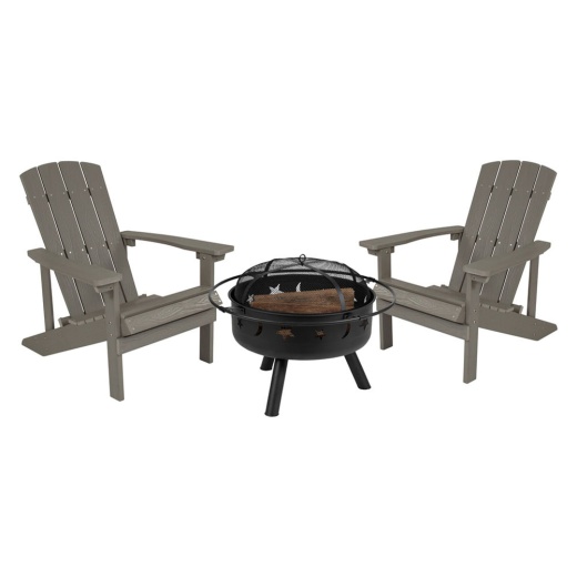 Take a break from the pressures of everyday life and find the perfect relaxation spot with this set of 2 commercial grade colorfull Gray adirondack lounging chairs and star and moon fire pit bundled set. This lounger has a wide back, slanted seat and wide arms so you can enjoy the outdoors in comfort. Constructed of weather-resistant polystyrene, the wood-like substance was designed to hold up in many environments and can be cleaned with a damp cloth. Chair has a vertical lattice back and is also UV protected and designed for outdoor use. Grab your flip flops and favorite swimsuit cover during summer evenings or a big bag of marshmallows, that superbly comfy sweatshirt and blanket when the leaves turn. This 2 chair and fire pit set gives you the perfect area for year round get togethers. The moon and stars in the sky won't be the only ones you see with this black outdoor wood fire pit. This gorgeous piece has moon and star mesh cutouts on the sides that provide ventilation for continual burning while adding charm with a bit of whimsy to your backyard. This fire pit has an attractive finish and comes with a mesh top to prevent sparks from escaping. This round backyard fire pit is made of iron for long lasting durability and has a high temperature coating that will look great season after season. Assembly takes less than 10 minutes for each chair so you can get down to the business of relaxing. Make great memories at home, the beach or at the campground with this fire pit and 2 chair combo.