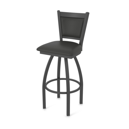 Refined design, craftsmanship, and comfort meet for this upholstered back swivel stool. Hadleighs contemporary base frame is constructed of 16-gauge, 1.25-inch tube steel with solid MIG-welded joints for strength and durability. Independently load tested to withstand 550 lbs. without failure (meets/exceeds BIFMA/ANSI standards). Powder coat finishes resist rust, chips, and abrasions to ensure sustained beauty. Customize your seat from an impressive upholstery selection for a cushion seat or select from a variety of wood finishes for a solid domestic hardwood seat. Cushion seats start with 2.5 inches of high-density foam for maximum support and longevity and are finished with commercial grade upholstery (vinyl or fabric). Wood seats are 1.25-inch solid hardwood (oak or maple) and deeply dished for comfort. The unique, padded, and double-upholstered back is contoured for comfort, providing a practical design aesthetic. Our extensive upholstery selection allows you to customize your back, even if with the wood seat option. Swivels are powder coated with 52 stainless steel ball bearings for smooth and consistent rotation.