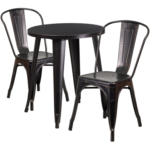 Complete your dining room, restaurant or patio with this chic table and chair set. This colorful set will add a retro-modern look to your home or eatery. Table features a smooth top and protective rubber floor glides. The stackable bistro chair features plastic caps that prevent the finish from scratching while being stacked. This 3 piece table set is designed for indoor and outdoor settings. For longevity, care should be taken to protect from long periods of wet weather. The possibilities are endless with the multitude of environments in which you can use this table, for both commercial and residential spaces. [CH-51080TH-2-18CAFE-BQ-GG]
