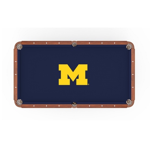 Looking to set your pool table apart from the others? Look no further than a Michigan Wolverines logo billiard cloth from the Holland Bar Stool Co. Manufactured by Hainsworth of England, they start with their renown Worsted cloth and the logo is dyed into the cloth resulting in a perfectly smooth, even play surface with no effect to ball play. Having a worsted cloth means it is woven with yarn that is combed to remove the short fibers, making the cloth smoother which results in balls running faster with much more consistent speed. Worsted cloth is more durable and will not compress to form gullies on the table. Hainsworth worsted cloth stands apart from other cloths on the market because it incorporates: finer yarn meaning greater thread count per inch; quality dye chemicals that coat the fibers better and are less likely to fade; extensive finishing to remove loose fibers to ensure the smoothest, flattest surface, increasing ball speed and consistancy; durability, stretch and quality of fiber checked at every stage of the manufacturing; state of the art modern manufacturing machinery to guarantee quality and construction of the cloth. If you are looking to cover your new table or put new life into an existing table, look no further than the Hainsworth logo cloth offered by the Holland Bar Stool Co. Cloth sets come with enough material to cover rails and bed.