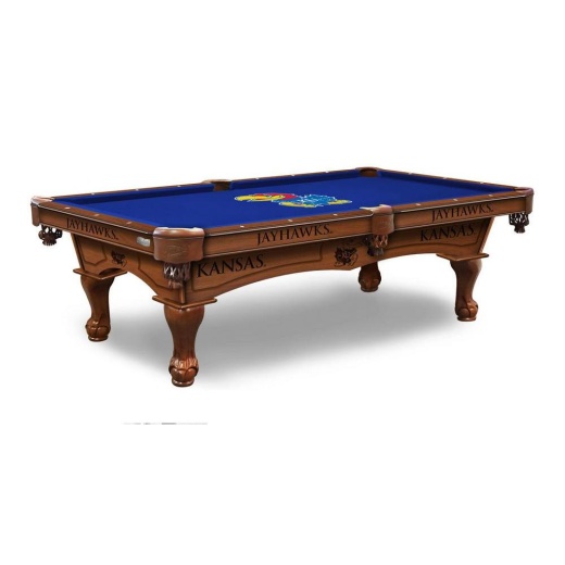 Nothing but the finest materials are used in these professional quality, Officially Licensed Kansas Jayhawks Logo Pool Tables from the Holland Bar Stool Co. The double-arch cabinet features beautiful CNC routing that accentuates the laser engraved logo art elements. Coordinating, embossed leather pockets with riveted nets match the look of the table and profile of the rail. The Diamond Pearl Sites are seamlessly inlaid into each of the rails for precision aim capabilities. The cabinet finish is second to none and incorporates a 14 step stain and lacquer process to ensure the high quality, furniture like finish you would expect from a table of this caliber. You choose from either of the two finishes, Chardonnay or Navajo. For the play surface, a 3 piece, diamond honed, 1 thick slate is utilized for sure and consistent ball play.Dont be fooled by professional cloth offered on other tables, this is the real deal! Hainsworth cloth is renown as one of the best pool cloths in the world. Finally, the table sits on your choice of legs. Choose from either the hand carved traditional Ball & Claw leg or the more contemporary, Taper leg. If you are in the market for a high quality, Officially Licensed Logo Pool Table, look no further than this one from the Holland Bar Stool Co.