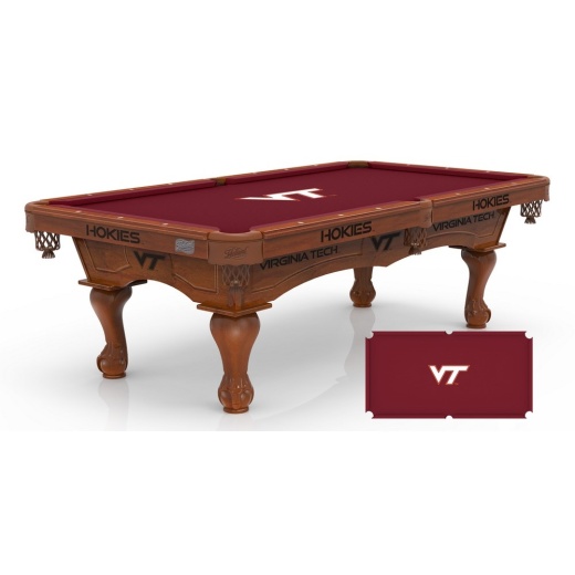 Nothing but the finest materials are used in these professional quality, Officially Licensed Virginia Tech Hokies Logo Pool Tables from the Holland Bar Stool Co. The double-arch cabinet features beautiful CNC routing that accentuates the laser engraved logo art elements. Coordinating, embossed leather pockets with riveted nets match the look of the table and profile of the rail. The Diamond Pearl Sites are seamlessly inlaid into each of the rails for precision aim capabilities. The cabinet finish is second to none and incorporates a 14 step stain and lacquer process to ensure the high quality, furniture like finish you would expect from a table of this caliber. You choose from either of the two finishes, Chardonnay or Navajo. For the play surface, a 3 piece, diamond honed, 1 thick slate is utilized for sure and consistent ball play.Dont be fooled by professional cloth offered on other tables, this is the real deal! Hainsworth cloth is renown as one of the best pool cloths in the world. Finally, the table sits on your choice of legs. Choose from either the hand carved traditional Ball & Claw leg or the more contemporary, Taper leg. If you are in the market for a high quality, Officially Licensed Logo Pool Table, look no further than this one from the Holland Bar Stool Co.