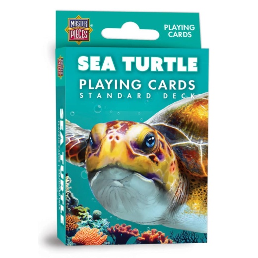 Make waves at game night with these Sea Turtle Playing Cards by Masterpieces! This standard 52-card deck (plus 2 jokers) is anything but ordinary. Each card showcases unique sea turtle-themed illustrations showcasing the grace and beauty of these gentle marine creatures. All the number cards feature a fascinating sea turtle fact or way to help sea turtles that'll surprise and delight players of all ages. From nesting behaviors to migration patterns—making every hand both fun and educational. Whether you're playing classic card games or teaching new ones, these cards are sure to be a hit with fans of all ages. Perfect for marine life lovers, students, educators, and anyone who enjoys a fresh take on traditional card games. Shuffle into the sea – one card at a time. Did you know that turtle eggs increase nutrients on beaches?
